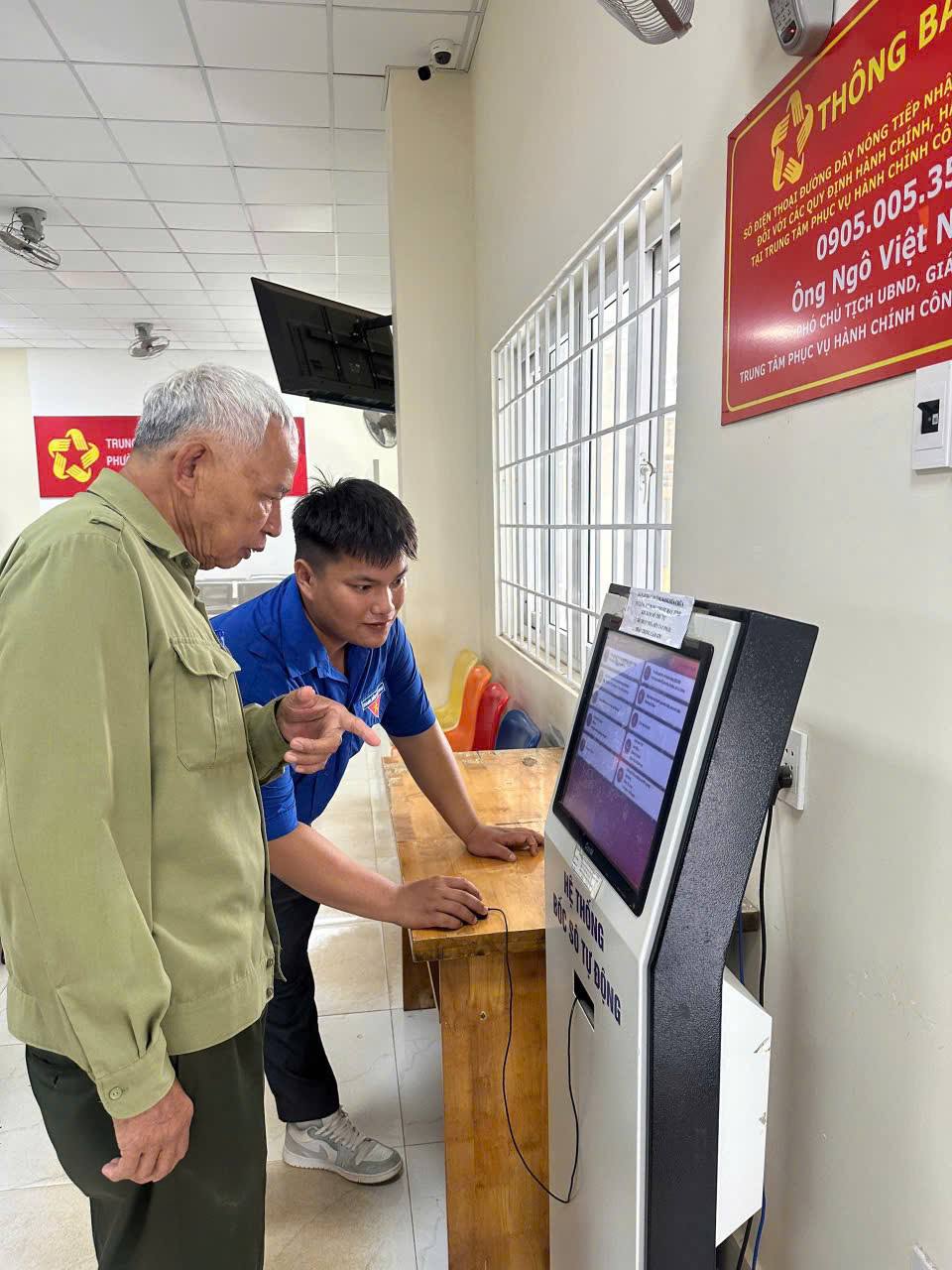 Đoàn viên thanh niên phường Buôn Hồ hỗ trợ người dân thao tác trực tuyến