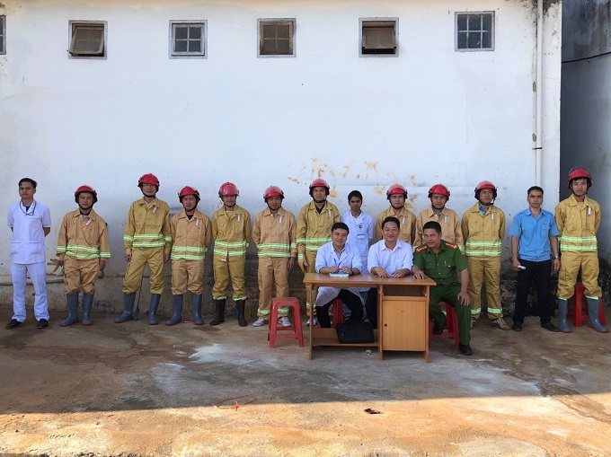 Lãnh đạo cùng các đội viên đội PCCC cơ sở Bệnh viện đa khoa thị xã