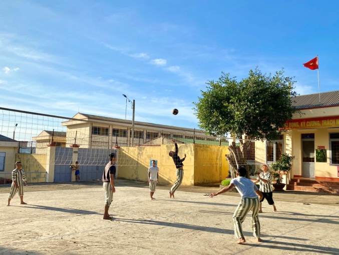 Hình ảnh phạm nhân chơi bóng chuyền sau giờ lao động