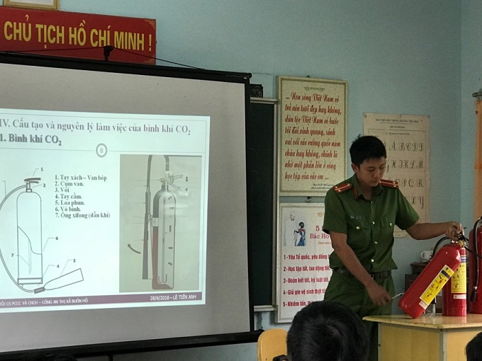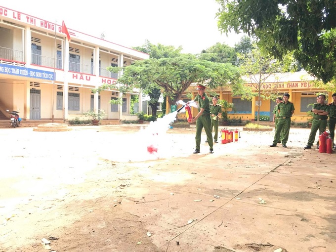Cán bộ Đội PCCC và CNCH Công an thị xã Buôn Hồ trực tiếp hướng dẫn cách các thiết bị chữa cháy