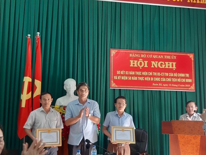 Đ/c Y Vinh Tơr - TUV, Bí thư Thị ủy trao giấy khen cho các tập thể đạt thành tích tiêu biểu trong 03 năm thực hiện Chỉ thị 05-CT/TW