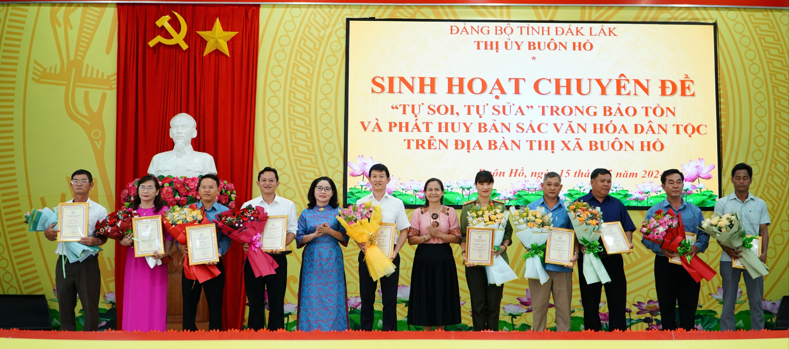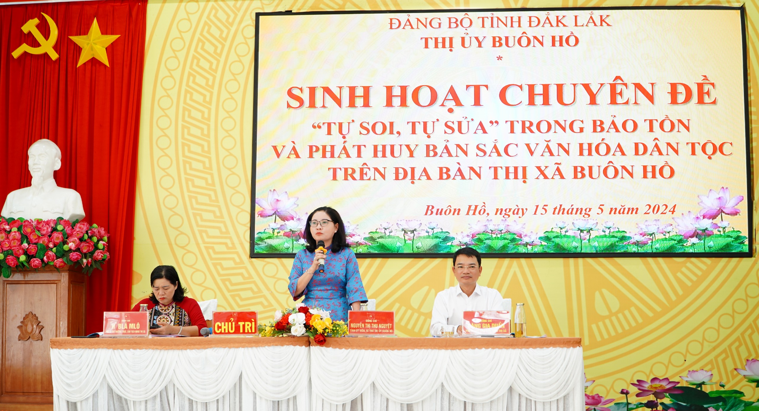 Tại buổi sinh hoạt chuyên đề đã tập trung “Tự soi, tự sửa” về vai trò, trách nhiệm tham mưu của các cơ quan chuyên môn trong việc bảo tồn và phát huy bản sắc văn hóa các dân tộc trên địa bàn thị xã Buôn Hồ; thực hiện nhiệm vụ phát triển kinh tế gắn với công tác bảo tồn, phát huy các giá trị văn hóa truyền thống dân tộc trên địa bàn thị xã. Đồng thời, “Tự soi, tự sửa” vai trò, trách nhiệm của Đảng ủy, chính quyền cơ sở trong lãnh đạo, chỉ đạo và triển khai việc bảo tồn, duy trì lễ hội truyền thống, công tác quản lý và phát huy có hiệu quả các thiết chế văn hóa; qua đó đề xuất giải pháp nhằm phục dựng, bảo tồn văn hóa truyền thống, khôi phục, phát triển làng nghề gắn với mục tiêu phát triển kinh tế….