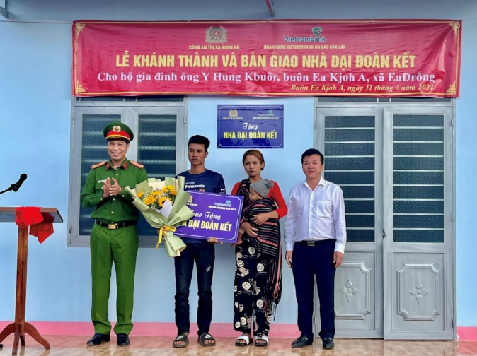 Ngày 11/3/2024, Công an thị xã Buôn Hồ đã tổ chức Lễ khánh thành, bàn giao nhà đại đoàn kết cho hộ gia đình anh Y Hung Kbuôr nhân dịp kỷ niệm 76 năm Chủ tịch Hồ Chí Minh có 6 điều dạy CAND (11/3/1948 – 11/3/2024); 49 năm ngày Giải phóng thị xã Buôn Hồ (12/3/1975 – 12/3/2024). Đồng chí Thượng tá Nguyễn Danh Bằng – UV.BTV Thị ủy, Bí thư Đảng ủy, Trưởng Công an thị xã chủ trì buổi Lễ. Tham dự có đồng chí Y Sem Ayun – Thị ủy viên, Phó Trưởng Ban dân vận Thị ủy; Đồng chí Hoàng Văn Sơn – Phó Chủ tịch UBND xã Ea Drông; Đại diện cấp ủy, chính quyền địa phương xã Ea Drông, buôn Ea Kjoh A; Ông Mai Văn Phúc – Phó Chủ tịch Công đoàn, Trưởng phòng Ngân hàng TMCP Ngoại thương Việt Nam - CN Bắc Đắk Lắk; Ông Hoàng Quốc Việt – Giám đốc Doanh nghiệp tư nhân xây dựng Việt Châu; Lãnh đạo, chỉ huy, CBCS Công an thị xã Buôn Hồ, CAX Ea Drông.
