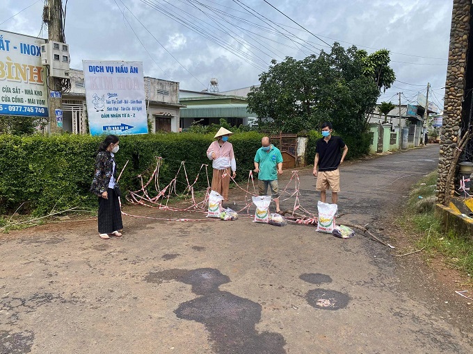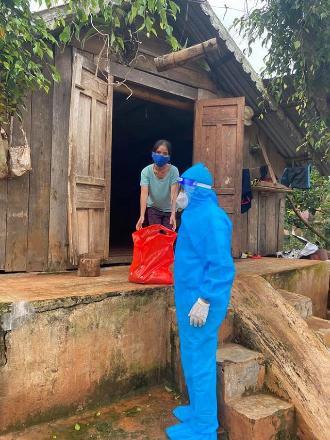 Tình nguyện viên trao quà cho người dân khu phong tỏa xã Ea Drông