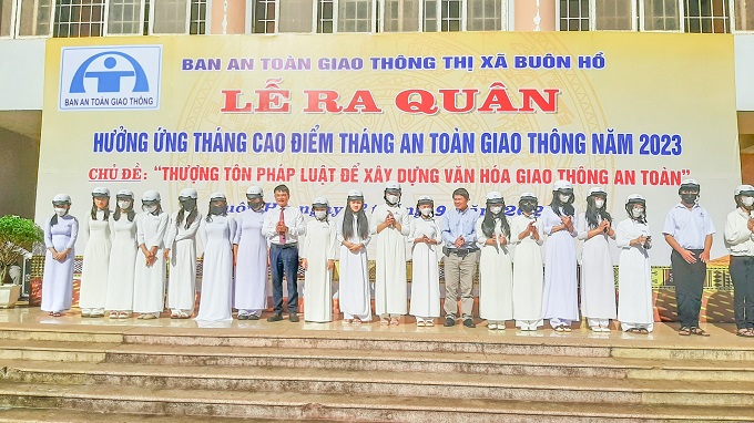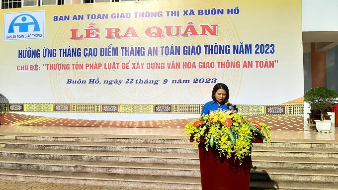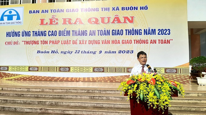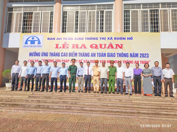 Sáng 22/9, Ban An toàn giao thông TX. Buôn Hồ tổ chức lễ ra quân hưởng ứng tháng cao điểm tháng ATGT năm 2023. Tham dự buổi lễ có đồng chí Đặng Gia Duẩn, Phó Bí thư thị ủy, Chủ tịch UBND, Trưởng ban ATGT TX Buôn Hồ; ông Bùi Văn Ngọc, Chánh văn phòng Ban An toàn giao thông tỉnh Đăk Lăk cùng đại diện lãnh đạo các phòng ban, đơn vị, đoàn viên thanh niên trên địa bàn.