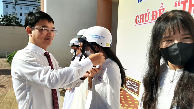 Trong dịp này, Ban An toàn giao thông của thị xã đã tặng mũ bảo hiểm cho 20 em học sinh.