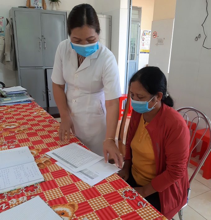 Bác sĩ H’Yôk hướng dẫn cán bộ y tế thôn, buôn thực hiện tốt công tác chuyên môn