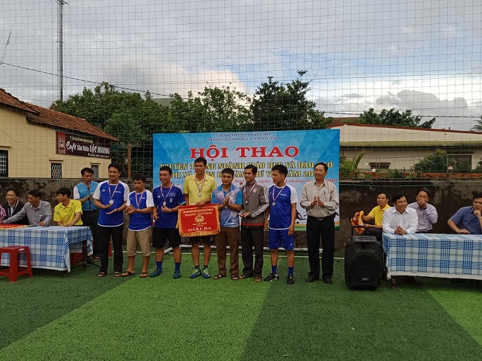 Lãnh đạo PGD&ĐT thị xã Buôn Hồ trao cờ lưu niệm cho các đội tham gia Hội thao