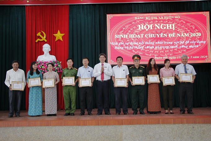 Sáng ngày 15/5/2020, Ban Thường vụ Thị ủy Buôn Hồ tổ chức Hội nghị sơ kết 4 năm thực hiện Chỉ thị 05-CT/TW của Bộ Chính trị về “Đẩy mạnh học tập và làm theo tư tưởng, đạo đức, phong cách Hồ Chí Minh” và Sinh hoạt chuyên đề “Giữ gìn sự đoàn kết thống nhất trong nội bộ để xây dựng Đảng và hệ thống chính trị trong sạch, vững mạnh” nhằm thiết thực chào mừng kỷ niệm 130 năm Ngày sinh Chủ tịch Hồ Chí Minh. Tham dự hội nghị có gần 150 đại biểu là đại diện lãnh đạo Ban Tuyên giáo Tỉnh ủy; các đồng chí Ủy viên Ban Chấp hành Đảng bộ thị xã Buôn Hồ khóa XV; bí thư, phó bí thư các TCCS Đảng trực thuộc Thị ủy; trưởng, phó các cơ quan, ban, ngành, mặt trận, các đoàn thể thị xã và tương đương; các đồng chí Chủ tịch HĐND, UBND, Ủy ban MTTQ Việt Nam các xã, phường; các đồng chí được trao Huy hiệu 40 năm tuổi Đảng trở lên; tập thể, cá nhân được biểu dương, khen thưởng trong việc học tập và làm theo tư tưởng, đạo đức, phong cách Hồ Chí Minh và Phóng viên Báo Đắk Lắk, Đài Truyền thanh – Truyền hình thị xã đến dự, đưa tin.