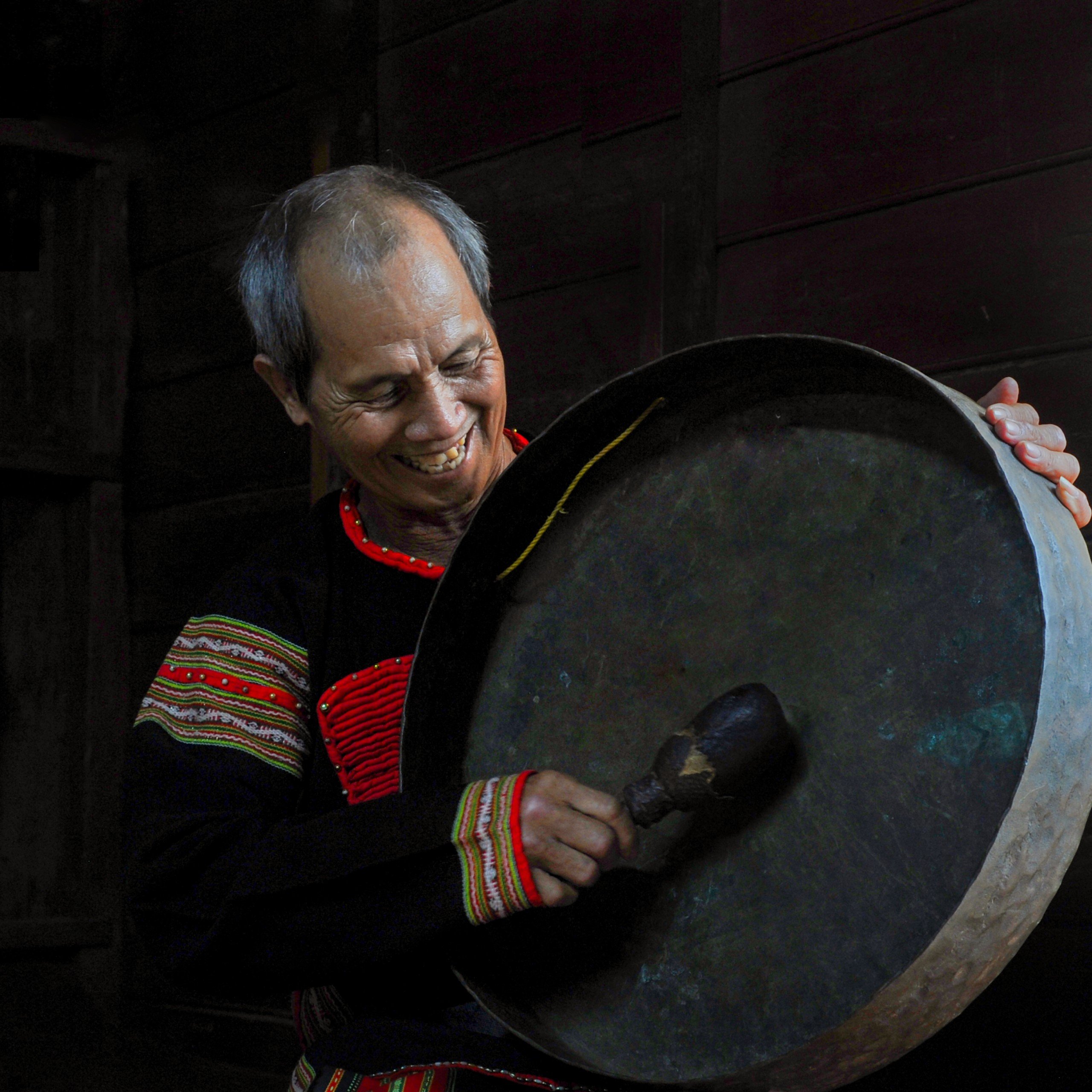 Nghệ nhân đánh cồng chiêng ở Buôn Tring, phường An Lạc, thị xã Buôn Hồ
