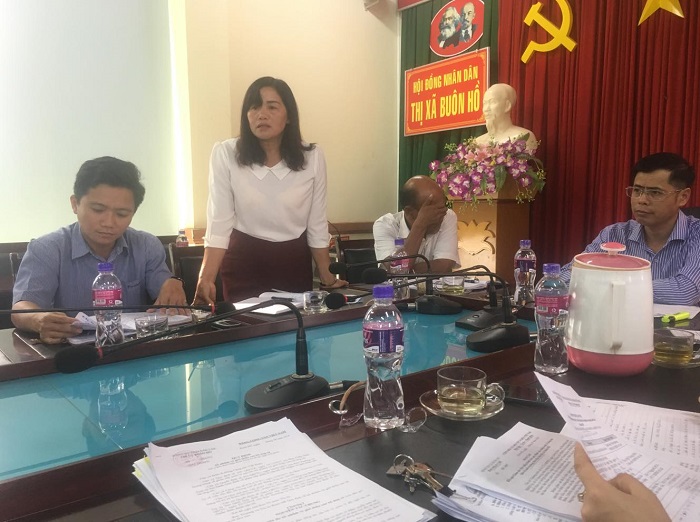 Bà H Blă Mlô – Phó Bí thư Thị ủy, Trưởng ban Pháp chế HĐND thị xã phát biểu tại hội nghị