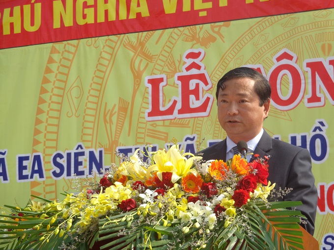 Đ/c Y Vinh Tơr, TUV, Bí thư Thị ủy phát biểu tại buổi lễ và tặng hoa chúc mừng xã Ea Siên