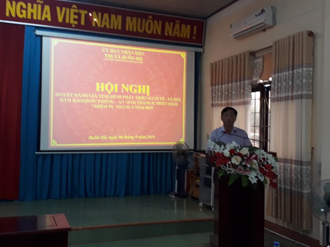 Phát biểu chỉ đạo tại Hội nghị, đồng chí Phạm Phú Lộc - Chủ tịch UBND thị xã yêu cầu trong tháng 9/2019 các phòng, ban, đơn vị thị xã, Chủ tịch UBND các xã, phường tập trung thực hiện một số nhiệm vụ trọng tâm sau đây: chỉ đạo hướng dẫn nhân dân sản xuất vụ Thu Đông năm 2019 theo khung thời vụ; tập trung triển khai thực hiện Chương trình mục tiêu Quốc gia xây dựng nông thôn mới; tăng cường công tác quản lý trật tự xây dựng, quản lý các quy hoạch xây dựng đã được phê duyệt; tổ chức kiểm tra vệ sinh an toàn thực phẩm dịp Tết Trung thu 2019; tập trung giải quyết đơn thư khiếu nại, tố cáo, KNPA đúng trình tự, thủ tục quy định của pháp luật; tổ chức tốt công tác tiếp công dân đảm bảo theo quy định; tăng cường công tác hòa giải tranh chấp ở cơ sở; thực hiện tốt công tác tư pháp, hộ tịch, chứng thực trên địa bàn; triển khai các bước tuyển quân theo quy trình, đảm bảo chỉ tiêu số lượng và chất lượng tuyển quân năm 2020; tăng cường công tác đảm bảo an ninh nông thôn, bảo đảm an ninh chính trị, trật tự an toàn xã hội, chủ động tấn công, trấn áp các loại tội phạm; thực hiện các biện pháp bảo đảm an ninh trật tự, trật tự an toàn giao thông.
